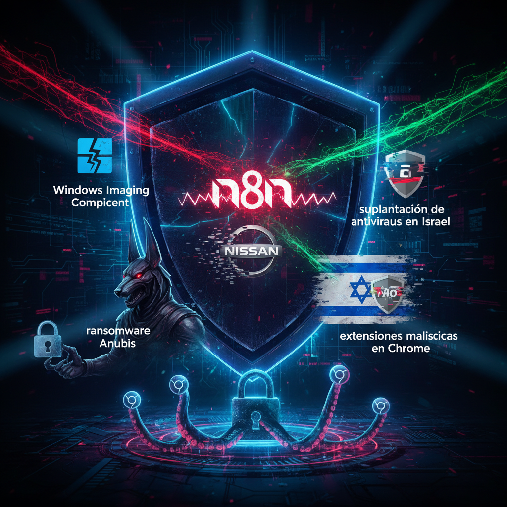 En las últimas 24 horas se han detectado vulnerabilidades críticas en Windows Imaging Component y en la plataforma de automatización n8n que permiten ejecuciones remotas de código, mientras que Nissan confirma una filtración masiva de datos; además, ataques con ransomware Anubis, suplantación de antivirus en Israel y extensiones maliciosas en Chrome amenazan la seguridad digital. Descubre estos y más detalles en el siguiente listado de noticias sobre seguridad informática: